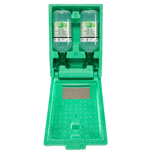 Plum Augenspülstation DUO für die gleichzeitige Spülung von beiden Augen, in staubgeschützter Wandbox. Mit zwei Augenspülflaschen DUO mit 1000 ml steriler Natriumchloridlösung