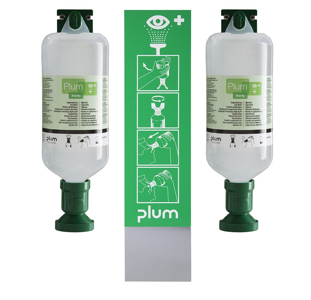 Plum Augenspülstation MAXI mit zwei Augenspülflaschen mit 2 x 1000 ml Natriumchloridlösung.